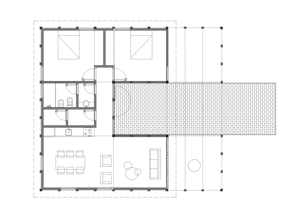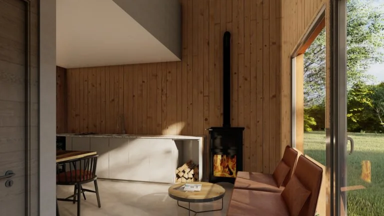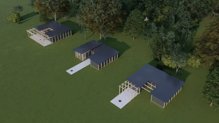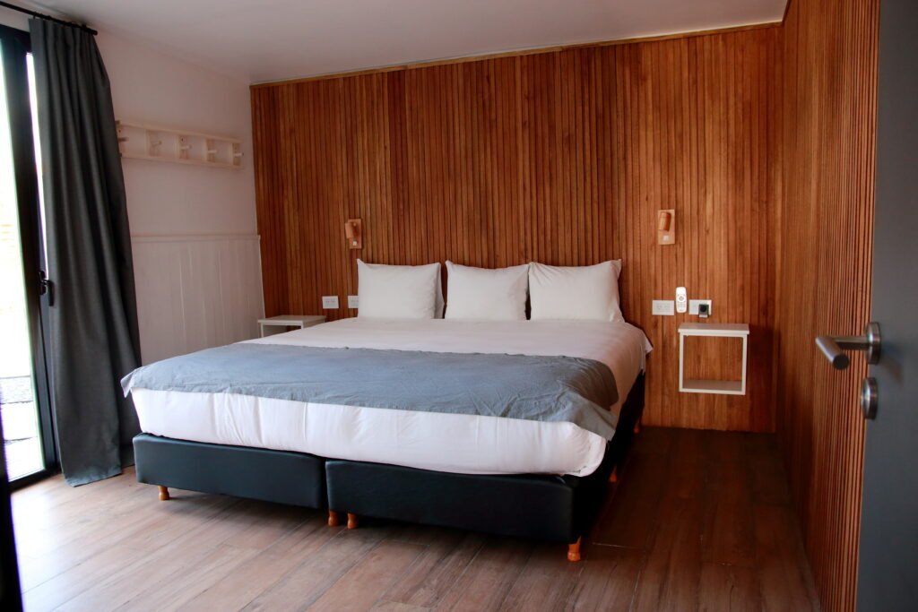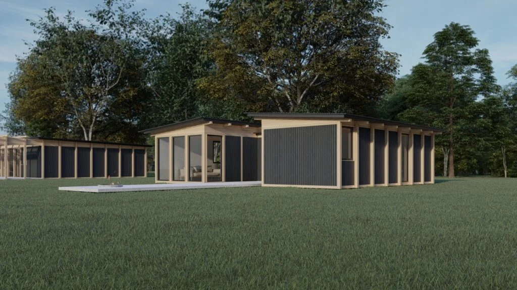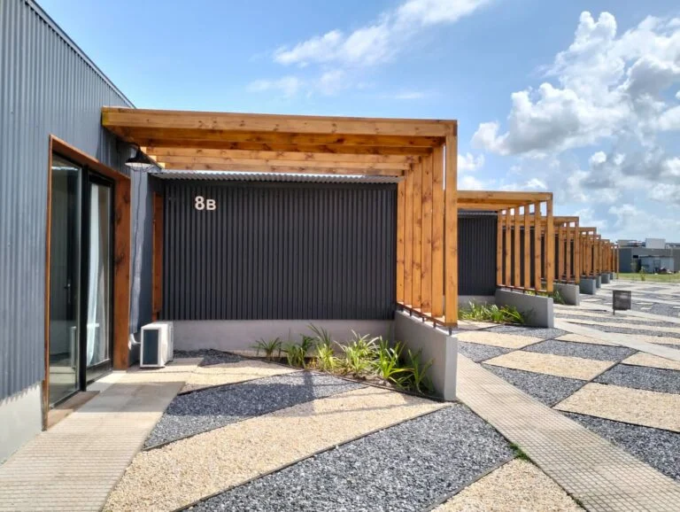 Cada unidad cuenta con uno o dos dormitorios, cocina completa, baño y un espacio semicubierto privado, pensado para disfrutar del entorno desde la intimidad. La disposición, orientación y apertura de las cabañas garantizan privacidad entre unidades, al mismo tiempo que aprovechan las visuales del paisaje circundante. Una propuesta que combina diseño, funcionalidad y conexión con la naturaleza.