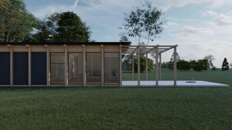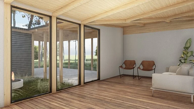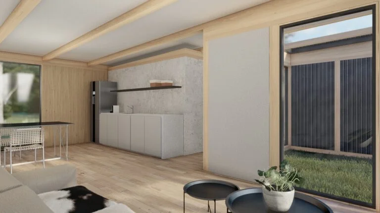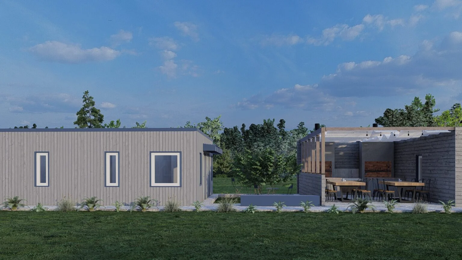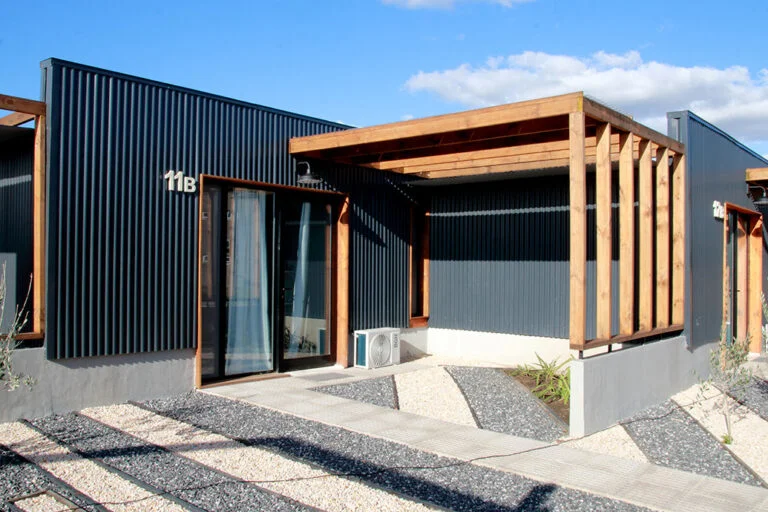 El proyecto contempla 10 viviendas construidas con sistema woodframe, con superficies que van de los 90 a los 110 m². Cada unidad cuenta con dos dormitorios, cocina equipada y espacios comunes pensados para el disfrute cotidiano.