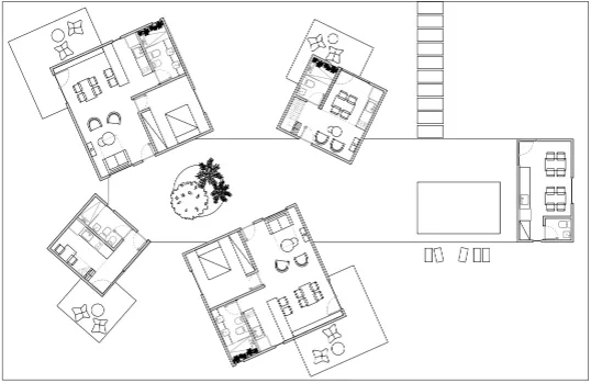 Diseñado en torno a un amplio jardín central que articula la pileta y las áreas de recreación, este proyecto propone un conjunto hotelero de 14 unidades funcionales distribuidas en una barra en forma de U.